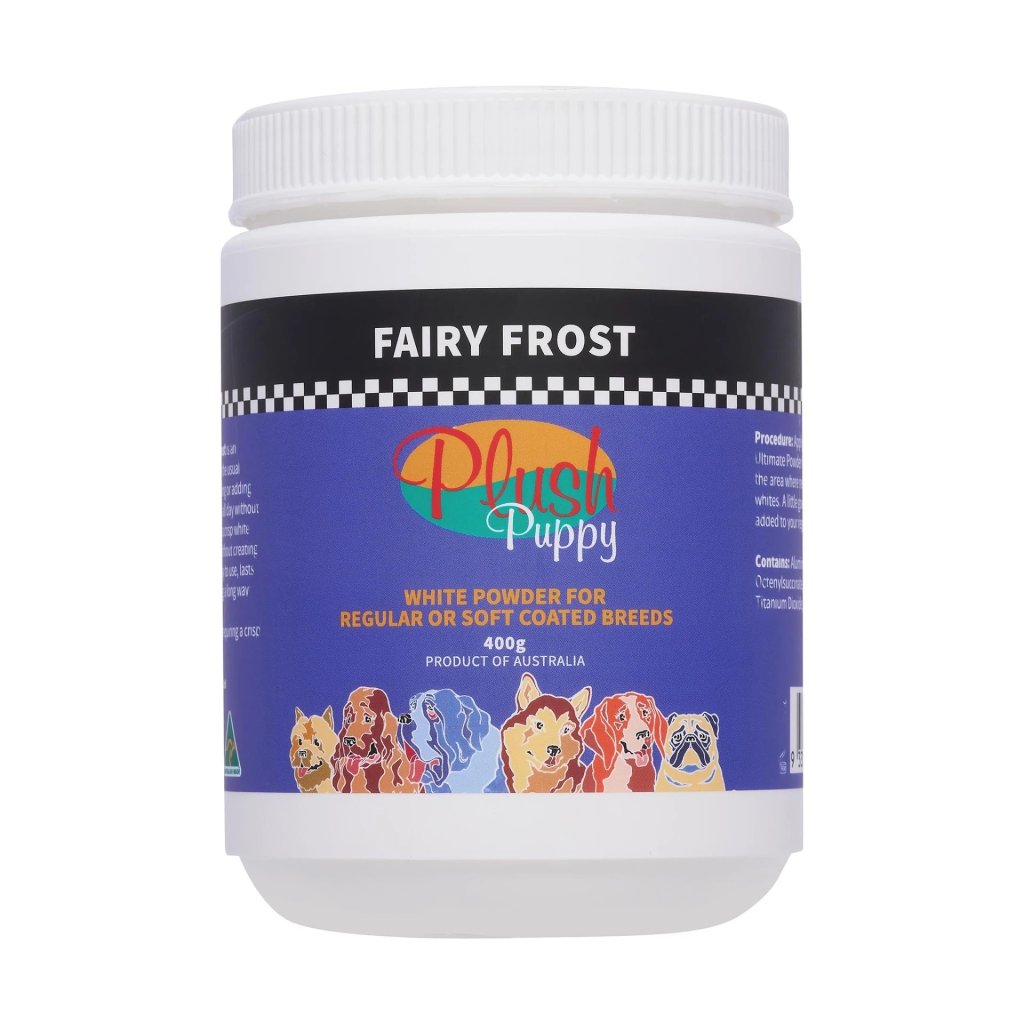 Plush Puppy Fairy Frost je ultrajemný, zářivě bílý pudr, který přináší modernější a účinnější řešení než klasické křídování nebo běžné bílé pudry do srsti.