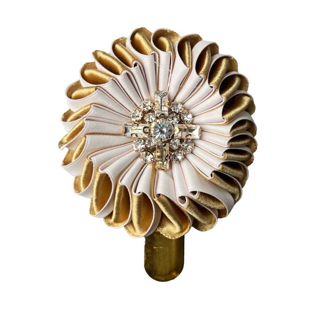 Krásná brož ve tvaru květu, vyrobená z lesklých stuh.