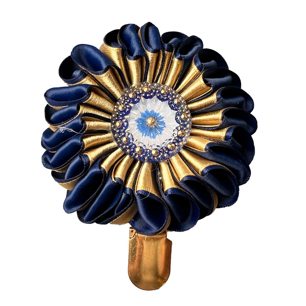 Krásná brož ve tvaru květu, vyrobená z lesklých stuh.