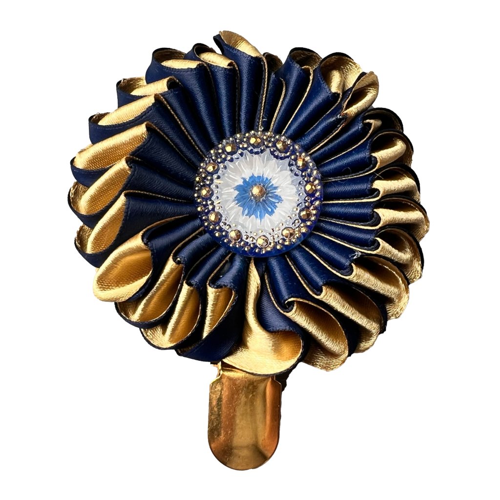 Krásná brož ve tvaru květu, vyrobená z lesklých stuh.