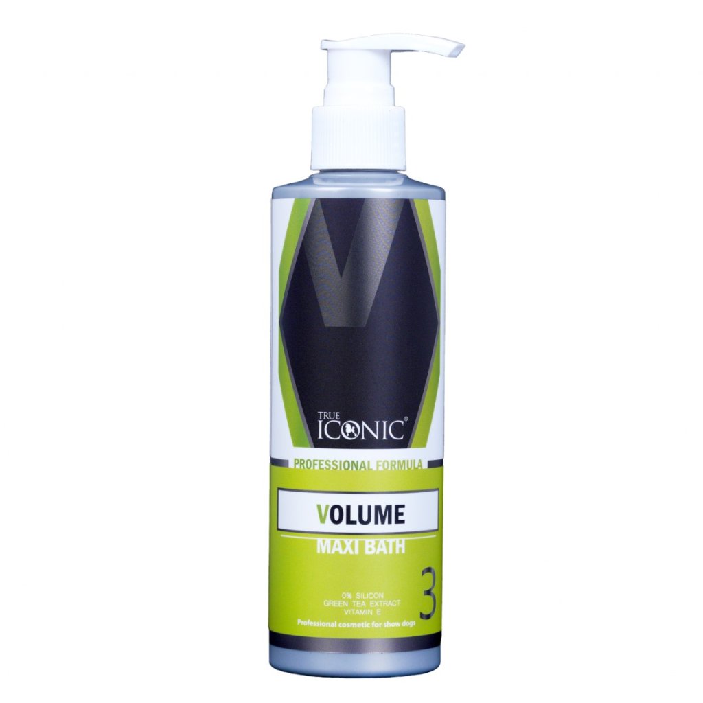 TRUE ICONIC Volume Maxi Bath zažijete jedinečný pocit hrubší a hutnější srsti, která získá na hustotě a objemu. Tento šampon nejenom šetrně čistí srst, ale také posiluje poškozenou srst, uzdravuje poničené folikuly a přináší srsti zvýšený objem a hustotu. Obsahuje vitamín E s antioxidanty, podporující buněčné složení, a extrakt ze zeleného čaje s epigallocatechin gallate pro posílení kořínků a aktivaci vlasových folikulů. Doporučujeme zejména pro plemena s kudrnatou a double coat srstí."